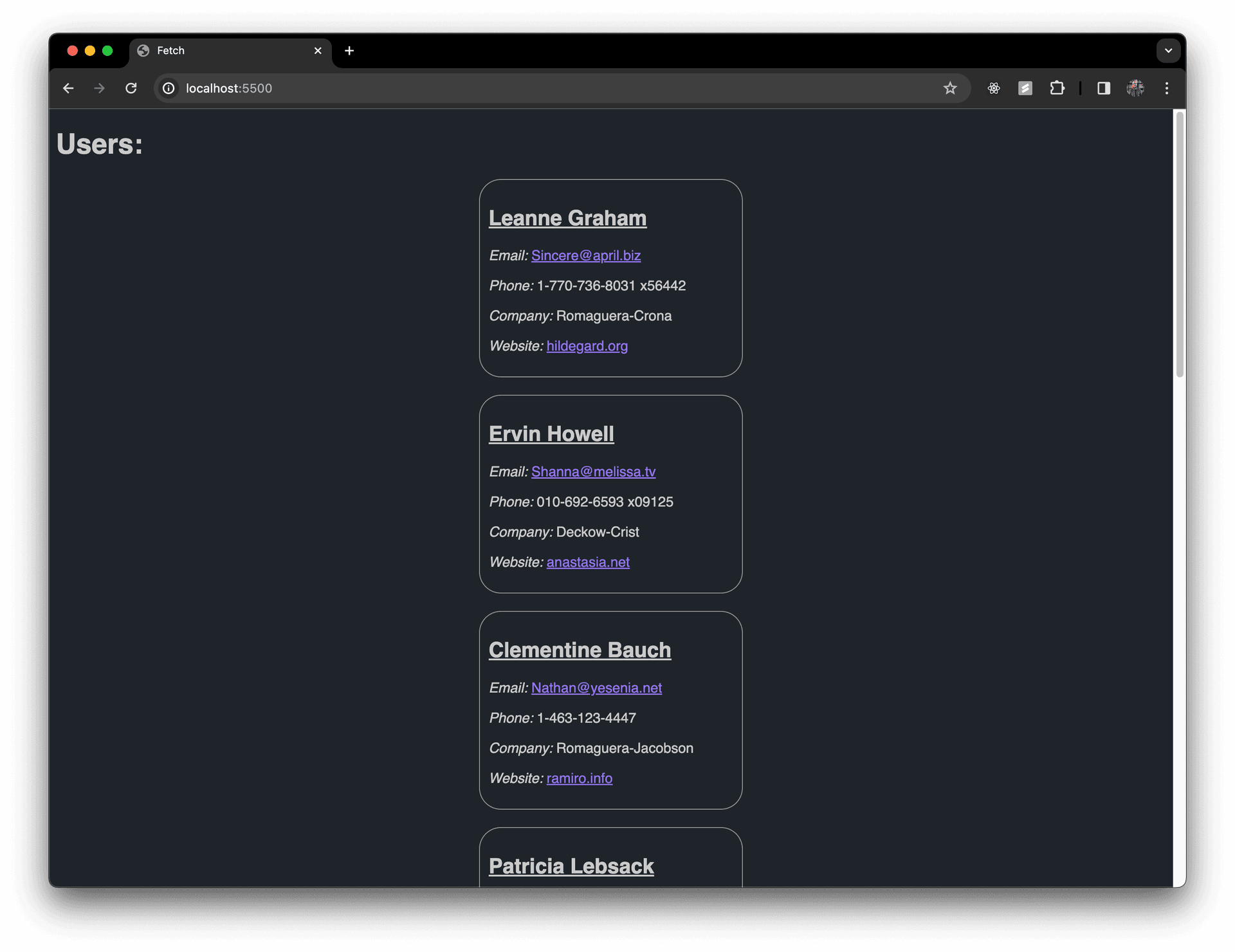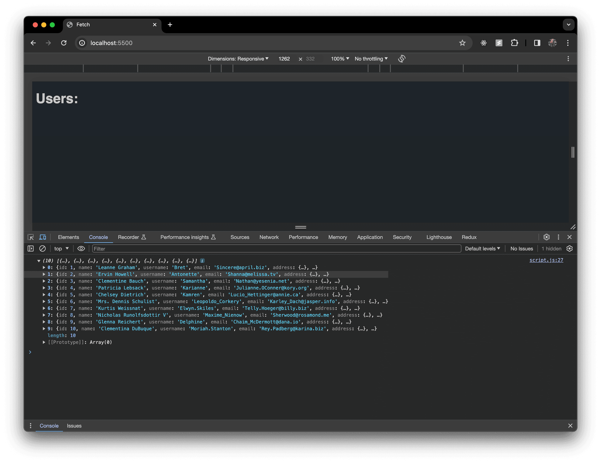 fetchUsers();- make sure all your files are saved and check out your browser. close your dev tools (the same way you open them) and you should see something like this: